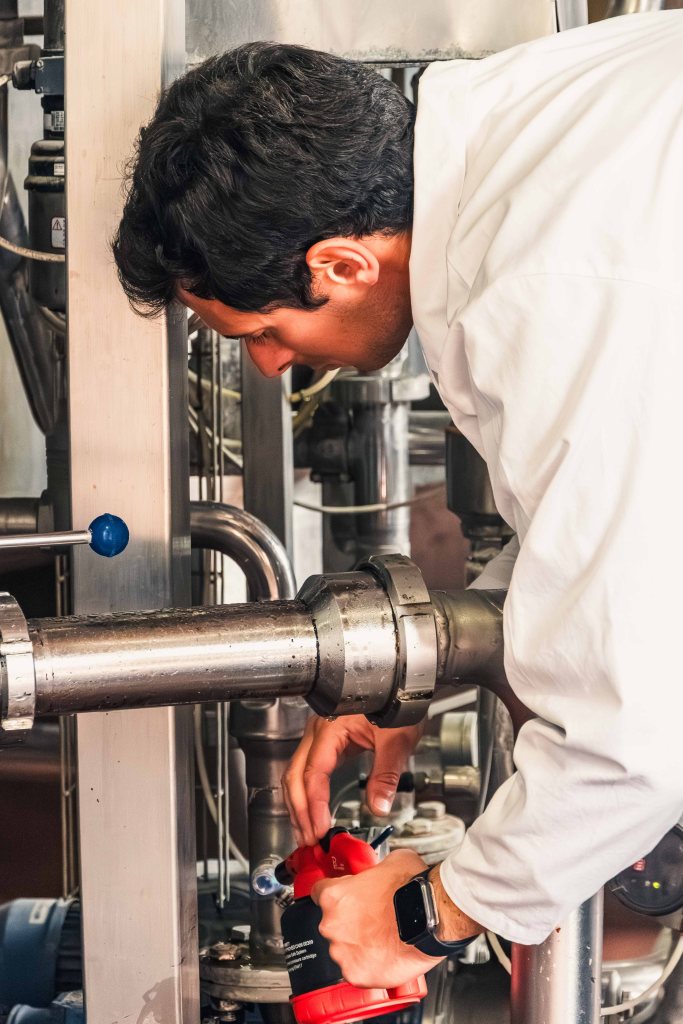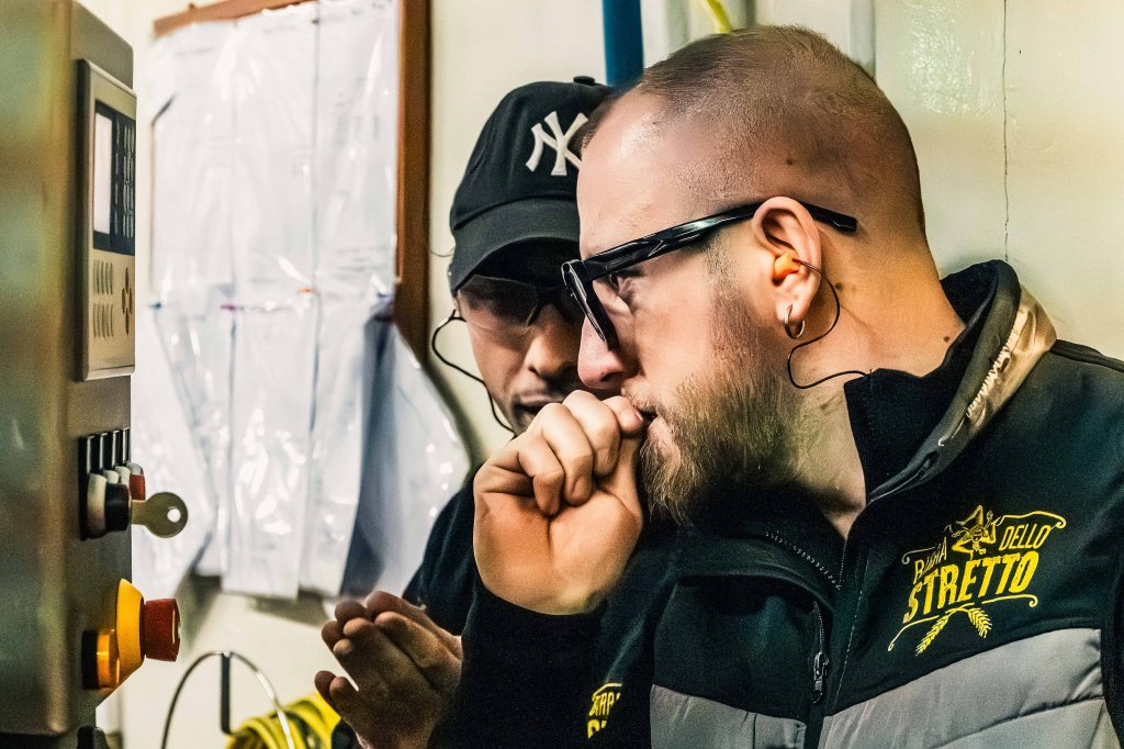 Matter is never still at Birrificio Messina. Water moves through steel, heat reshapes what it touches, liquid passes through darkness and emerges transformed. Yet this material process is inseparable from the force of human presence: from the people who made this enterprise possible by standing up, enduring, and risking all they had. Some of them appear here. So do the machines, with their tubes and gears intertwined in forms that photography can only partially render. And so too does the beer itself, born — almost syllogistically — from this encounter between labour, matter, and form.